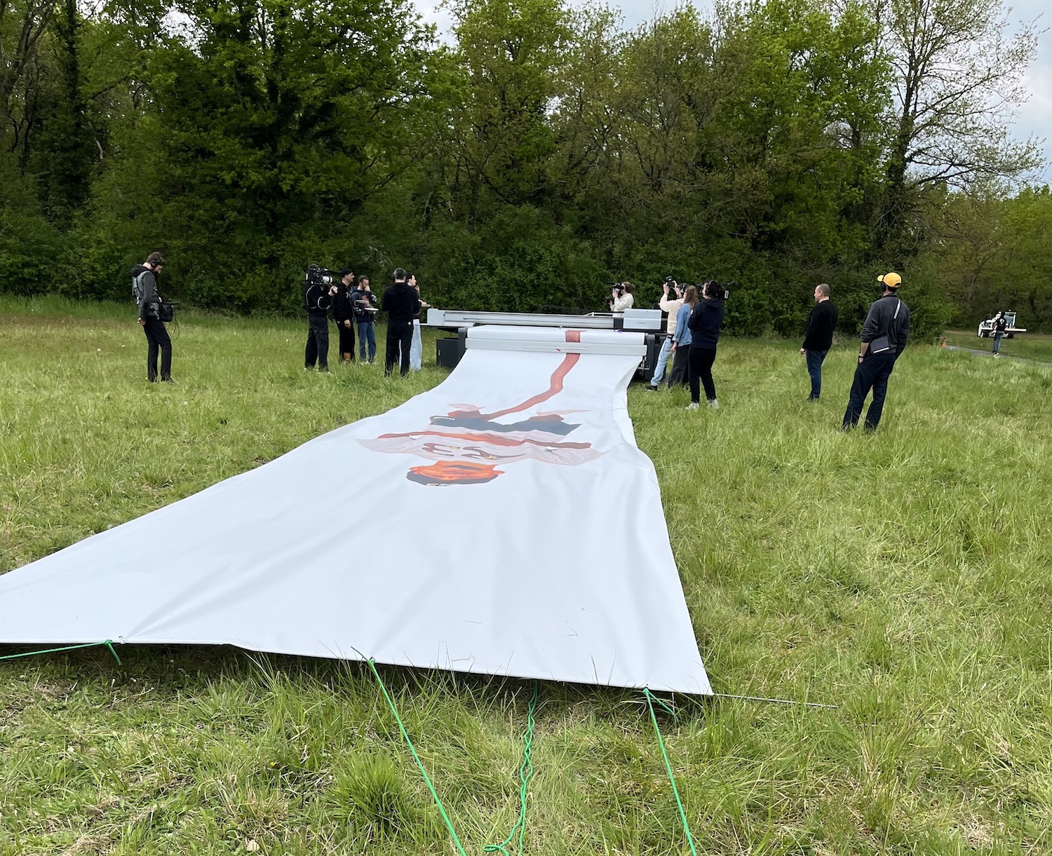 Challenge relevé avec l’impression XXL, de près de 35 mètres de long, du portrait géant de l’un des youtubeurs présents, en une seule prise et sous l’œil vigilant du drone !